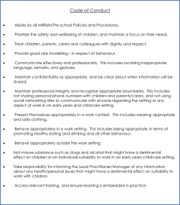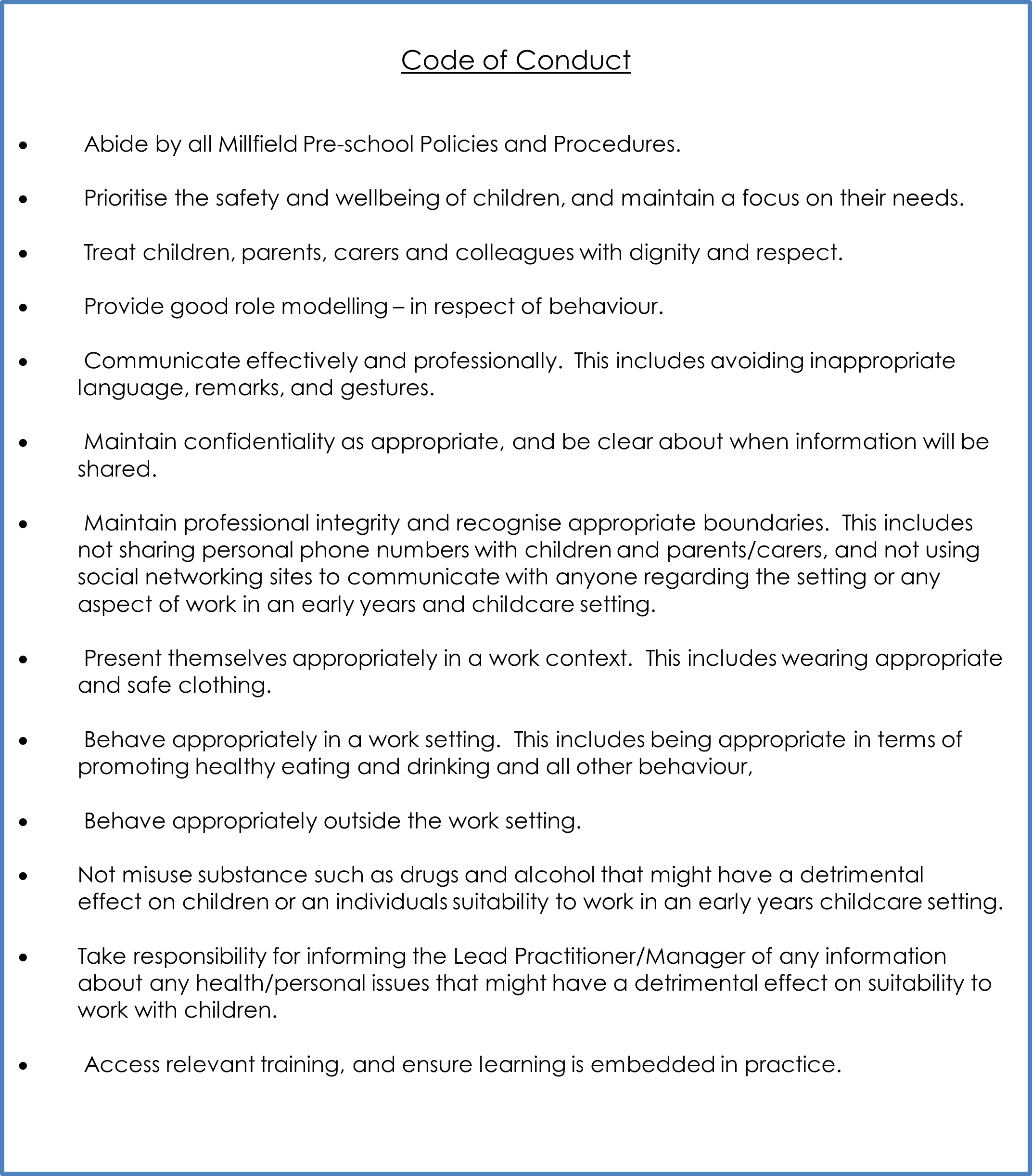The purpose of a ‘Code of Conduct’ is to ensure that all practitioners associated with Millfield Pre-school consistently maintain the highest possible standards of professional conduct, and to clearly identify to parents/carers what they can expect.