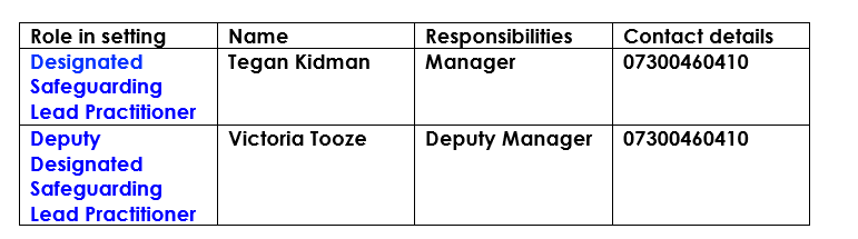 7.2 Any information detailed/recorded will be kept in a separate, confidential safeguarding file in a secure cabinet and not within the children’s general file. The Designated Safeguarding Lead/Deputy Practitioner will keep these files confidential. Any information within these files will only be shared with those that need to know in order to protect children in line with the referral process.