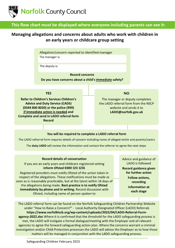 6.5 All adults who come into contact with children will be made aware of the steps that will be taken if an allegation is made. We will seek appropriate advice from the Local Authority Designated Officer (LADO). The LADO can be contacted on 01603 223473 and should be contacted within 24hours of the incident, especially if the allegation is against individuals who have direct contact with children.