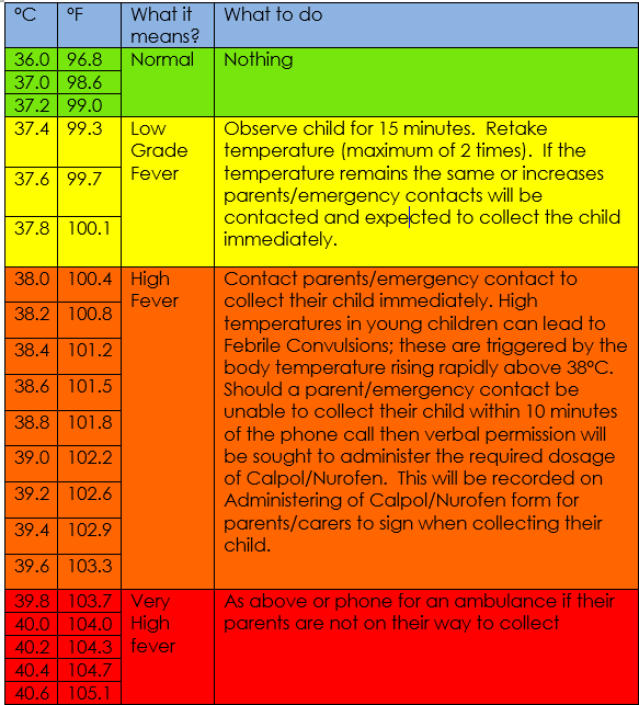 a. If your child’s temperature is taken and found to be in the low-grade fever category (see chart) in the indicated procedure will be actioned. Equally, if your child’s temperature is in the high fever category (see chart) the indicated procedure will be actioned.